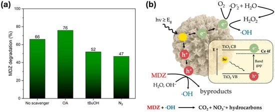 Free-radical trapping experiments were carried out for Ce1 in order to determine the main active species responsible for degradation (Figure 5). This test plays a crucial role in photodegradation studies as it helps identify and confirm the reactive radical species generated during light-induced degradation processes, introducing radical scavengers into the reaction environment. Specifically, the photocatalytic tests were performed in the presence of the target molecule, maintaining the same operating conditions (atmospheric pressure, room temperature, pH 4) but adding oxalic acid (OA, 0.6 mM), tert-butanol (tBuOH, 1 mM), and N2 (g) as holes, ·OH and ·O2− scavengers, respectively. The MDZ degradation is inhibited by adding N2 and tBuOH to the system, while it is not affected by the addition of OA. Thus, the major active species in drug degradation are hydroxyl and superoxide radicals. Based on these considerations, we propose a plausible mechanism for photodegradation, as summarized in Figure 5b. It can be noticed that the degradation efficiency in the presence of OA is slightly higher than that of the bare MDZ solution, which may be attributed to a comparable amount of OA relative to that of the catalyst, suggesting full hole scavenging and an overall increase in the reactivity of the two other radical species.