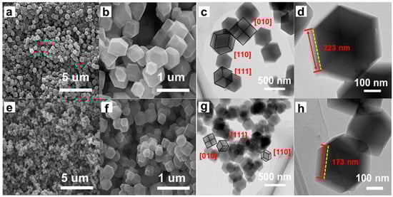 The SEM of (a,b) ZIF-67 and (e,f) ZnxCo1−x(2-MeIM)2. The TEM of (c,d) ZIF-67 and (g,h) ZnxCo1−x(2-MeIM)2.