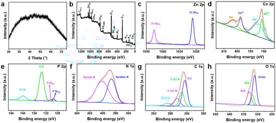 (a) XRD of Zn0.17Co0.83P@NC. XPS of Zn0.17Co0.83P@NC: (b) Survey; (c) Zn 2p; (d) Co 2p; (e) P 2p; (f) N 1s; (g) C 1s and (h) O 1s.