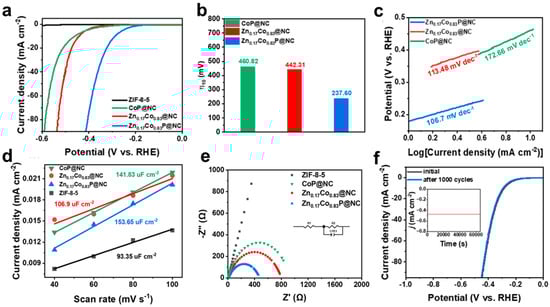 All electrochemical tests were performed under a standard three-electrode system. As shown in Figure 7a, ZIF-8-5 had no hydrogen evolution activity. After high-temperature calcination and gas-phase phosphating, the CoP@NC obtained has certain hydrogen evolution activity. The optimized Zn0.17Co0.83P@NC has the best HER performance, and its overpotential is 223.22 mV lower than that of CoP@NC (Figure 7b). Such a huge performance improvement is due to the obvious electronic regulation brought by the introduction of Zn. However, the more Zn content in the precursor is not the better, and the most suitable Zn doping content is 2.17 at.%. The Tafel slopes of Zn0.17Co0.83P@NC and Zn0.17Co0.83@NC were between 40 and 120 mV dec−1, indicating that they performed the HER process with the Volmer–Heyrovsky mechanism. Zn doping optimizes the adsorption–desorption behavior of H* intermediates on the electrode surface [,]. Zn0.17Co0.83P@NC has the smallest Tafel slope, which indicates that it has the fastest hydrogen evolution reaction kinetics (Figure 7c). Then, cyclic voltammetry (CV) was performed on all the samples, and their double-layer capacitance (Cdl) images were obtained after data processing. In Figure 7d, Zn0.17Co0.83P@NC has the largest Cdl (153.65 uF cm−2), indicating that Zn doping and phosphating can provide a larger active area and expose more active sites []. At the same time, Zn0.17Co0.83P@NC also has the smallest interfacial charge transfer resistance (Rct), indicating that it has the fastest interfacial charge transfer rate to accelerate the HER process (Figure 7e). Thanks to the presence of an amorphous carbon layer, Zn0.17Co0.83P@NC has good stability. After 1000 cycles of voltammetry, there was no significant degradation of HER performance (Figure 7f). And after 18 h of constant voltage stability test, it can still provide a stable hydrogen evolution current. As shown in Table 1, the Zn0.17Co0.83P@NC in this work has a high-efficiency performance of alkaline HER electrocatalysis, compared with other Co/Zn-based electrocatalysts reported.