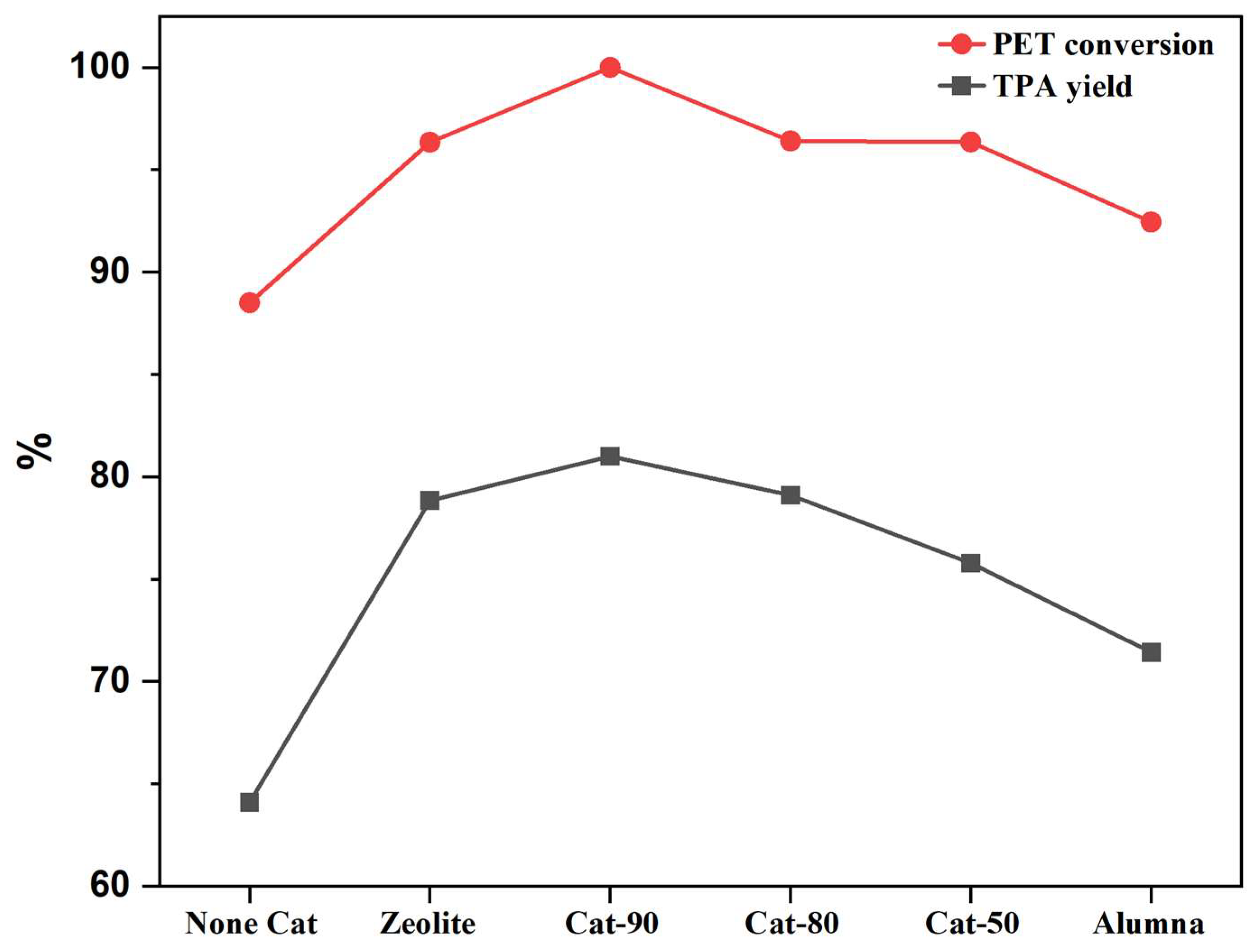 Figure 7 shows the effect of reaction temperature on PET conversion and TPA yield. The data showed a clear trend: as the temperature rose, the TPA yield also increased significantly. This suggests the hydrolysis reaction was strongly temperature-dependent under these conditions. To further investigate the catalyst’s performance at lower temperatures, additional experiments were conducted at 180 °C and 200 °C. At 180 °C, no significant reaction was observed, indicating that this temperature is below the activation threshold for effective depolymerization under these conditions. At 200 °C, the reaction proceeded at a slower rate compared to 210 °C, but the catalyst (Cat-90) still demonstrated significant activity and selectivity for TPA formation. The yield improved from 4.164% at 210 °C to 25.45% at 220 °C, which is approximately a 6-fold increase. Further increasing the temperature to 230 °C resulted in a yield of 55.53%, more than doubling the yield obtained at 220 °C. A significant increase in the PET conversion and TPA yield was observed with increasing reaction temperature. The conversion of PET showed a clear and rapid increase from 11.2% to 72.26% when the temperature increased from 210 °C to 230 °C. These findings are crucial for industrial recycling processes where maximizing the yield of PET hydrolysis is often desirable. Higher temperatures markedly enhanced process efficiency. However, higher temperatures also meant higher energy consumption and potential degradation of the PET or the formation of unwanted by-products. Thus, a balance must be struck between achieving high yields and managing operational costs and product quality.
