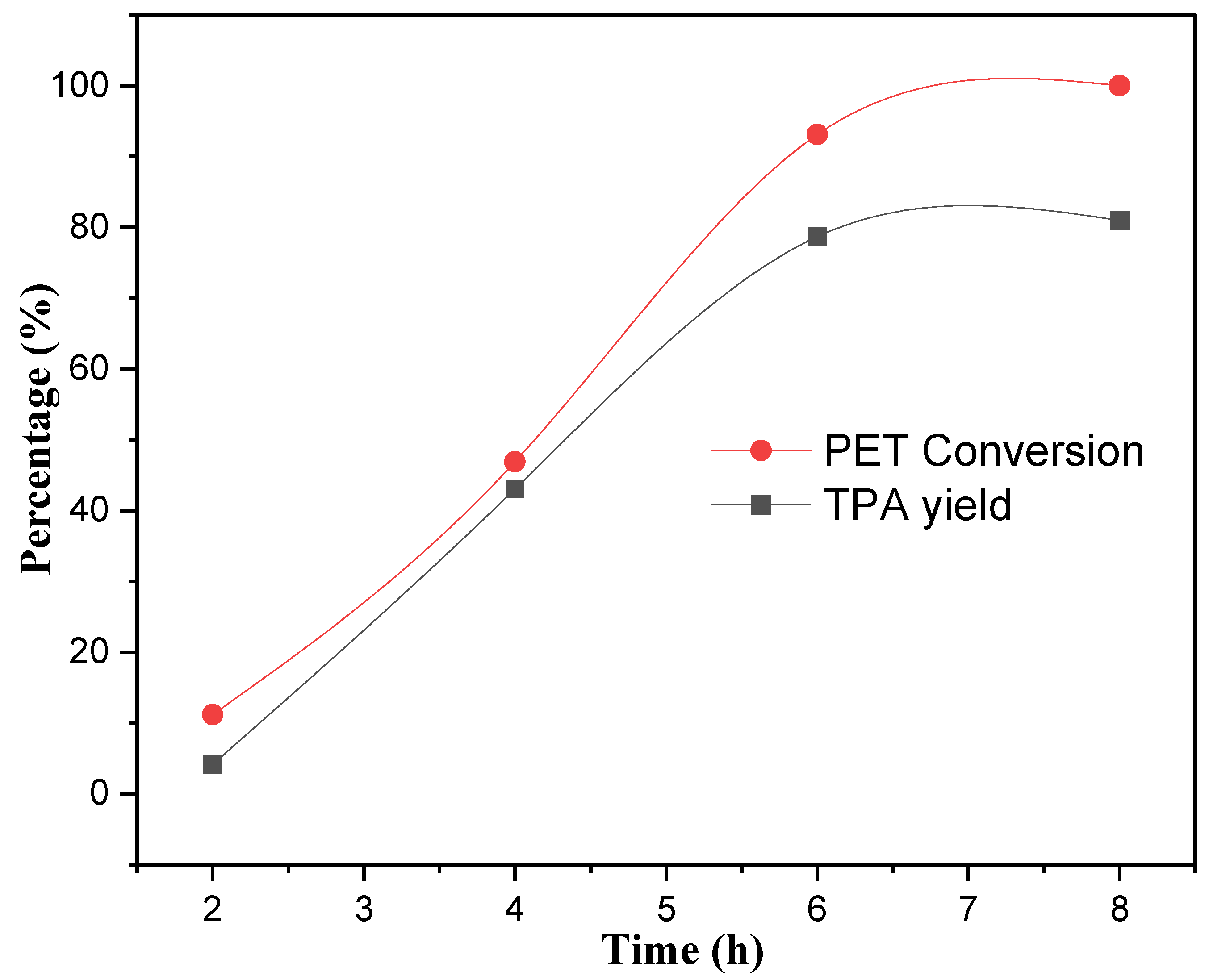 Figure 6 illustrates the effect of reaction time on PET conversion and TPA yield during neutral hydrolysis. The results showed a clear upward trend in TPA yield with increasing reaction time from 2 to 8 h. At 2 h of hydrolysis, the TPA yield is relatively low at 4.164%, indicating that the reaction had just begun and significant PET depolymerization had not occurred yet. As the hydrolysis time increases to 4 and 6 h, there is a substantial increase in TPA yield, with values of 43.04% and 78.671%, respectively. This suggests that more PET was being depolymerized into TPA as the reaction progressed. Finally, at 8 h of hydrolysis, the conversion was achieved at 100%, and the TPA yield reached 81%. The low conversion of PET flakes during the initial 2 h is attributed to PET’s limited solubility in water, which restricted the neutral medium from sufficiently swelling the PET surface. However, the majority of PET conversion to TPA took place within the first 4 h; a notable rise was observed as the reaction time was increased further.
