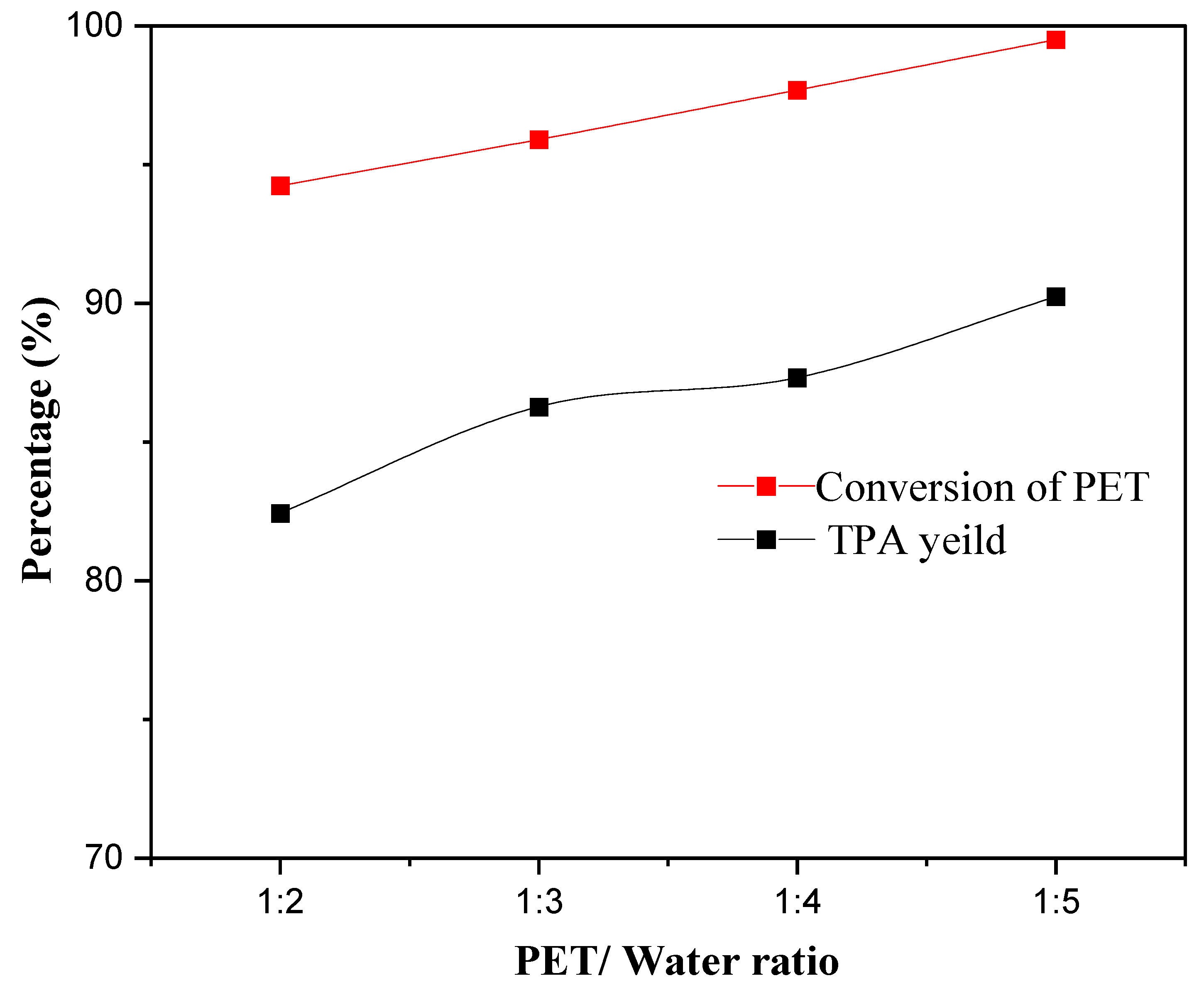 The effect of the weight ratio of water to PET on the neutral hydrolysis reaction at autogenous pressure for 6 h and at 210 °C are indicated in Figure 8. At the ratio of 1:2, the PET conversion percentage was 94.24%, indicating that a significant portion of PET had been depolymerized into TPA and ethylene glycol, and the TPA yield was 82.44%, suggesting that a substantial amount of TPA had been produced from the hydrolysis of PET at this ratio. With a slightly higher ratio of water to PET compared to the previous condition, the hydrolysis reaction may proceed more efficiently. The PET conversion percentage increases to 95.9%, indicating greater depolymerization compared to the 1:2 ratio, and the TPA yield also increases to 86.27%, reflecting the higher efficiency of the hydrolysis reaction at this ratio. The PET conversion percentage continues to rise to 97.68%, and the TPA yield increases slightly to 87.32% at the ratio of 1:4, indicating more complete depolymerization of PET. The PET conversion percentage reaches its highest value at 99.5%, indicating almost complete breakdown of PET chains under these conditions and the TPA yield also increases to 90.24%, indicating a high efficiency of TPA production from the hydrolysis of PET at a ratio of of 1:5. In general, the data show that increasing the water to-PET ratio led to higher PET conversion percentages and TPA yields. This was likely because a higher concentration of water promoted the hydrolysis reaction, resulting in more efficient depolymerization of PET and higher production of TPA.