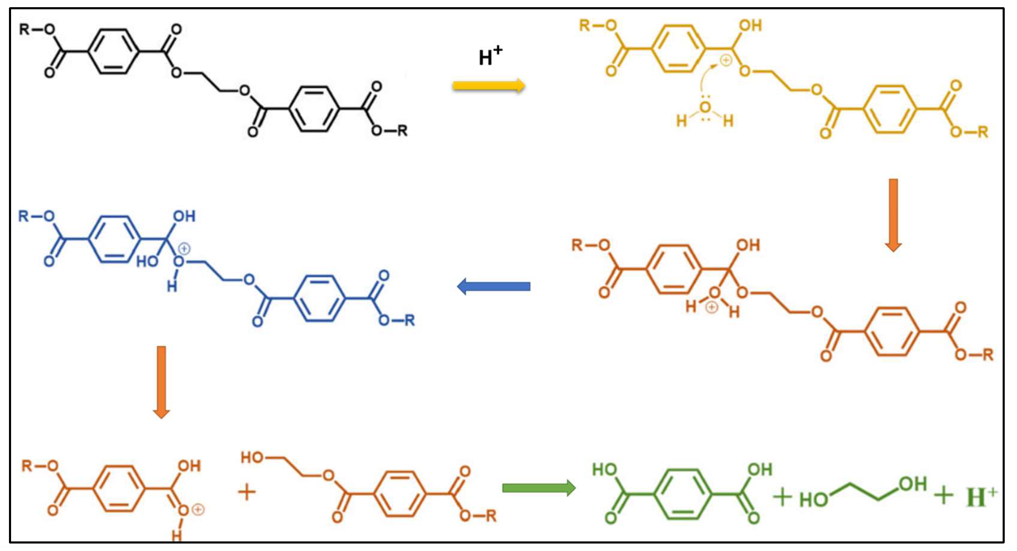 PET depolymerization via chemical hydrolysis initiates with the cleavage of ester linkages, producing oligomeric intermediates that are subsequently broken down into monomers. Since PET is insoluble in the reaction medium, hydrolysis predominantly occurs at the polymer’s surface, making surface area a key factor influencing reaction kinetics. In neutral hydrolysis, the catalyst’s acidity accelerates the reaction, which proceeds via a nucleophilic attack by water on the ester group. As supported by our catalytic performance data, this process is most efficient when there is a synergistic balance of Brønsted and Lewis acid sites. The mechanism involves two key functions provided by the catalyst: Brønsted acid sites generate hydroxonium ions that protonate the carbonyl group, lowering the activation energy (Ea) for the nucleophilic attack, while Lewis acid sites stabilize the carbocation intermediates formed during this process. This dual-site mechanism, in which BAS lowers the (Ea) and LAS provides stabilization, facilitates faster and more efficient reaction rates, with the subsequent steps proceeding along the standard ester hydrolysis pathway. Subsequent steps follow the standard ester hydrolysis pathway, yielding TPA and EG as the final products of PET hydrolysis [35,42]. Figure 11 illustrates the mechanism of PET hydrolysis. It is important to acknowledge that while our experimental observations and characterization data strongly support this proposed mechanism, we did not perform in situ spectroscopic studies (such as DRIFTS or in situ Raman spectroscopy) during the reaction. Such techniques would be required to directly observe the reaction intermediates or the dynamic changes on the catalyst surface, thereby providing definitive proof of the proposed mechanistic pathways. We suggest that further in situ mechanistic studies would be a valuable area for future research to gain a deeper and more conclusive understanding of the catalytic process.