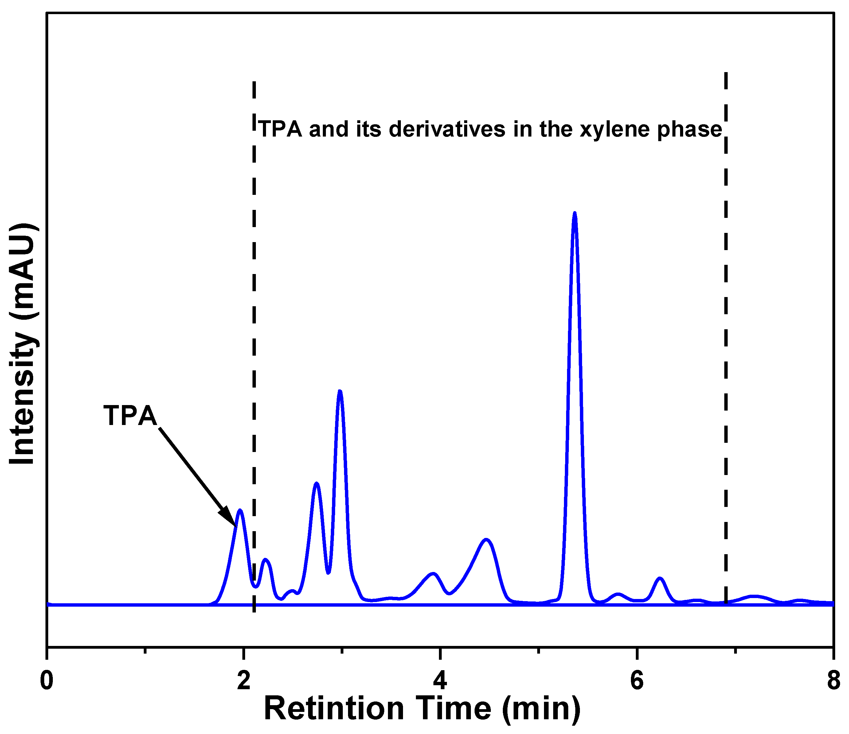 Upon completing the reaction, analysis of the xylene phase using HPLC revealed several additional peaks compared to pure xylene. These new peaks likely correspond to dissolved TPA and/or its derivatives formed during the reaction. This indicates that xylene is not merely a passive solvent but is involved in the dissolution of reaction intermediates [51]. The presence of TPA and its derivatives in the xylene phase suggests that these compounds partitioned, are partitioning into the xylene phase rather than remaining in the aqueous phase, where they could have undergone further transformations to yield the final TPA product.