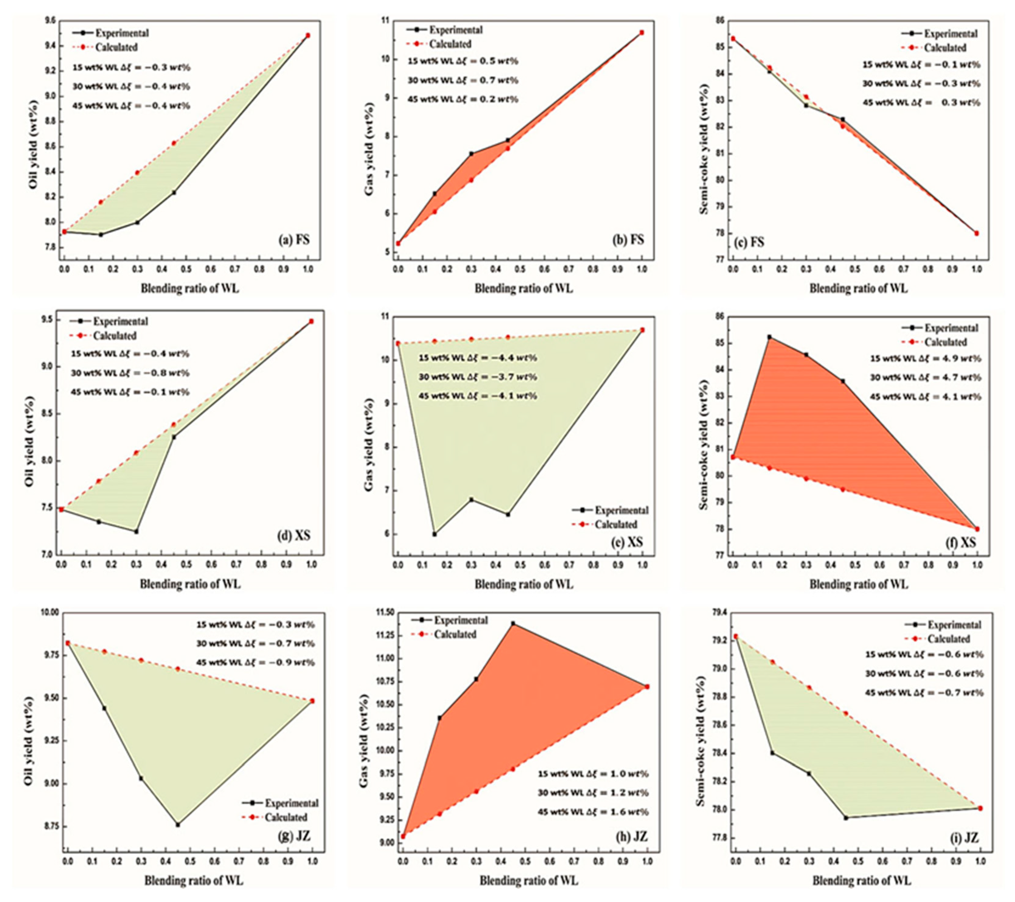 2.2.2. Interactions Between the Selected Oil Shales at Different Blending Ratios