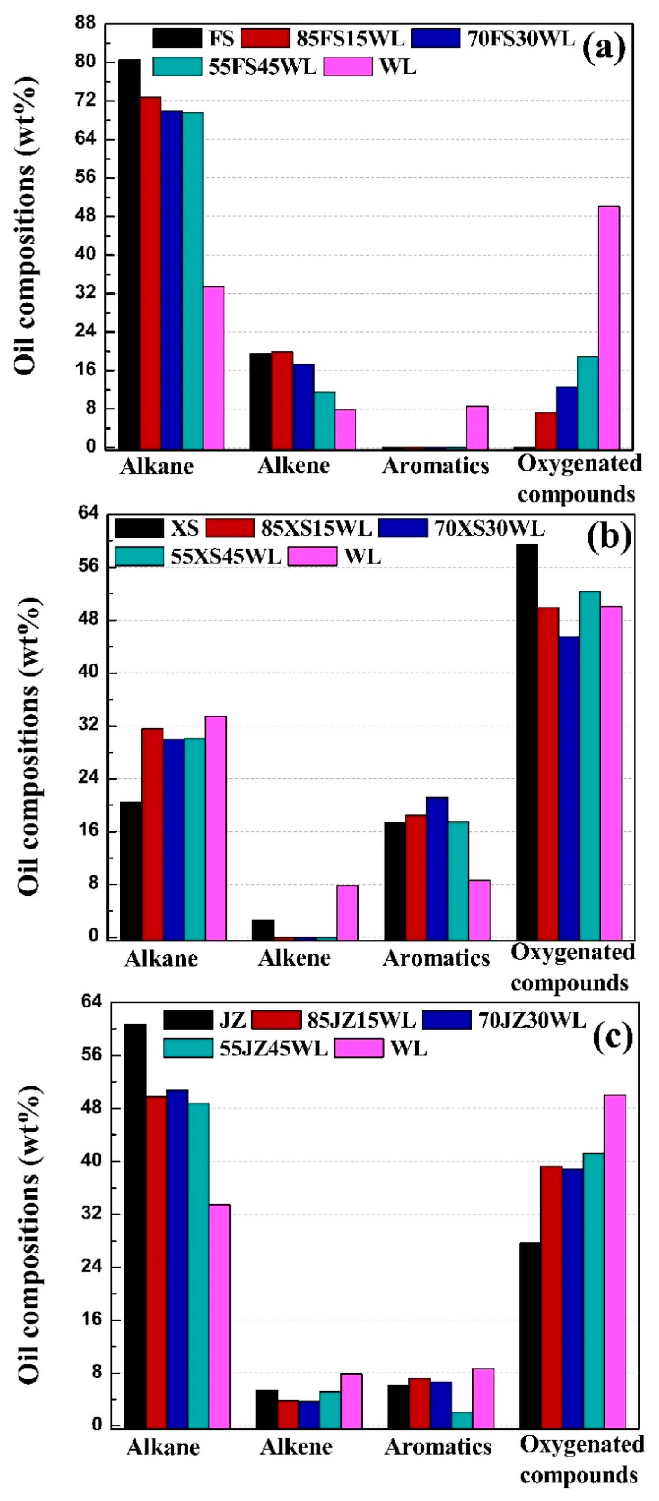 2.4. Effects of Oil Shale Blending on Product Distribution