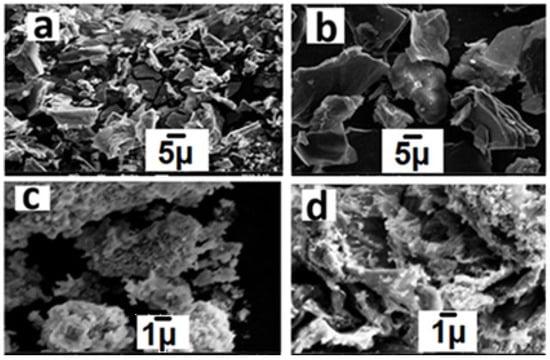 SEM image of NiO (a), GO (b), and NiO-GO nanocomposite before degradation (c) after degradation (d).