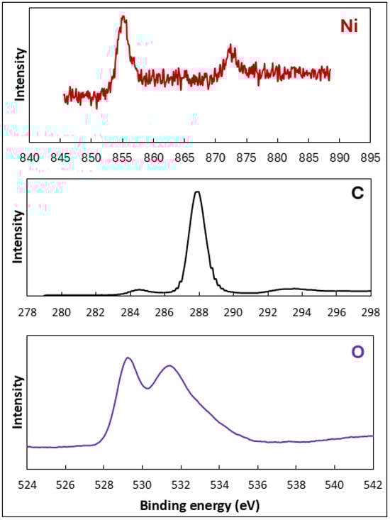 X-ray photoelectron spectroscopy was employed for the determination of the elemental composition and oxidation state of the fabricated NiO-GO. Figure 3 illustrates the XPS analysis of NiO-GO. The XPS analysis confirms the presence of Ni, O, and C elements in fabricated NiO-GO, indicating the successful formation of NiO on the graphene oxide surface without any impurity peaks. The high-resolution Ni 2p spectrum exhibits two main peaks at around 854.2 eV and 871.4 eV, corresponding to Ni 2p3/2 and Ni 2p1/2, respectively, along with their associated satellite peaks. These features are characteristic of Ni2+ species in NiO, confirming the oxidation state of nickel in the composite. The C 1s spectrum shows peaks around 284.6 eV and 288.1 eV, attributed to sp2 carbon components and C-O single bond components of hydroxyl groups, respectively. Shoulder peaks at 286.9 and 289.6 eV are associated with the C=O bond and the C atom, respectively. Pu et al. [47] have assigned the peaks at 284 eV and 289 eV to C=C and O–C=O, respectively. These features confirm that the oxygen-containing groups of GO remain partially intact after composite formation, providing anchoring sites for NiO nanoparticles. The O 1s spectrum can be deconvoluted into multiple components, typically centered at about 529.3 eV and 531.2 eV, representing lattice oxygen (O2− in Ni–O bonds) and surface-adsorbed oxygen or hydroxyl groups, respectively. The relatively higher intensity of surface oxygen peaks suggests the presence of oxygen-containing functional groups originating from GO, which could enhance interfacial interaction and charge transfer between NiO and GO [48,49,50,51].