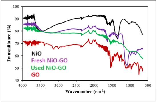FTIR spectrum of NiO, GO, and NiO-GO before and after degradation.