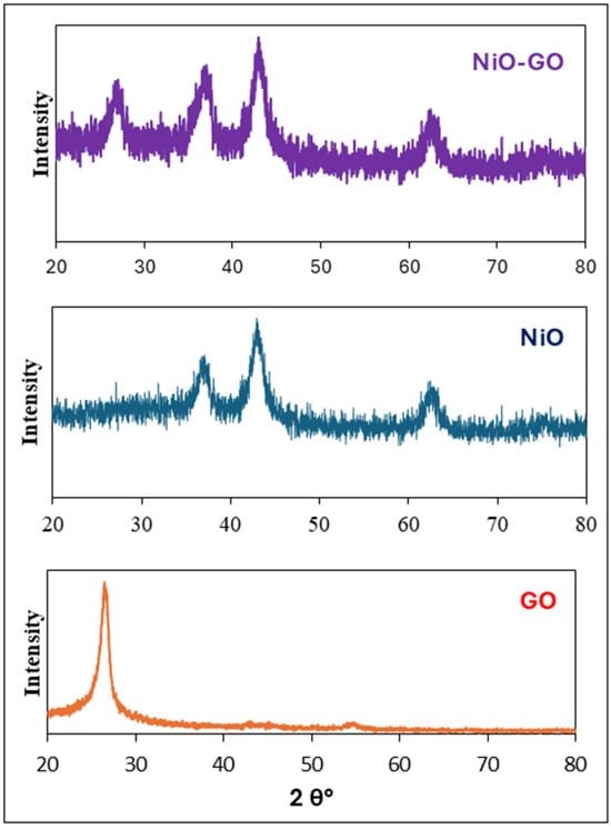 The purity and crystallinity of the NiO, GO, and NiO-GO composite were determined by XRD analysis. The XRD of GO shows a peak at about 26°, which is a representative peak of GO as given in Figure 5. This peak represents the 002 plane of GO [26,59]. The diffraction patterns of NiO exhibited reflection peaks located at diffraction angles (2θ) of approximately 37°, 42°, and 62°, as illustrated in Figure 3. These peaks represent the crystal planes 111, 200, and 220 of NiO, respectively. The diffraction peaks with high intensity represent the face-centered cubic unit of nickel oxide nanoparticles of strong crystallinity. The crystal shape of the NiO nanoparticles synthesized in the present study appeared to be accurately similar and comparable with the reported chart (JCPDS card no. 47–1049). The XRD of NiO-GO indicates peaks for both GO and NiO with a slight shift in peak positions. Hence, the XRD confirms the successful synthesis of NiO-GO [51,60]. Online Sherrer’s equation was used for the calculation of crystallite size. The crystallite size for GO, NiO, and NiO-GO was calculated as 4.1, 46.5, and 4.3 nm, respectively.