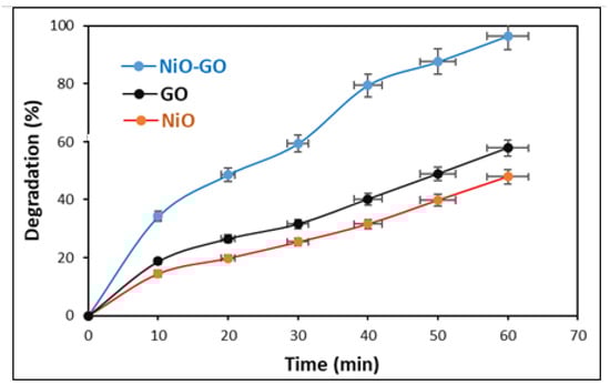 For comparison of photocatalytic activities of NiO, GO, and NiO-GO, separate degradation experiments of clothianidin were conducted in the presence of NiO, GO, and NiO-GO. The concentration of clothianidin was kept at 20 ppm, while the initial pH was kept at 3. The dose of each catalyst was 0.05 g. Before the addition of the catalyst, clothianidin solution was stirred under visible light for 30 min to determine the removal of clothianidin by photolysis. The analysis of the reaction mixture confirmed that there was no change in the concentration of clothianidin during stirring in visible light. This result shows that there is no removal or degradation of clothianidin due to photolysis. Afterwards, the removal of clothianidin by adsorption was also verified. It was performed by stirring the catalyst containing clothianidin solution for 30 min under dark conditions. About a 13% decrease in the concentration of clothianidin was observed by sorption at GO. Similarly, about a 20% decrease in concentration was noticed with each of NiO and NiO-GO. After confirmation of photolysis and adsorption, the photocatalytic degradation of clothianidin was initiated by stirring the reaction mixture under visible light irradiation. Samples were taken every 10 min and analyzed. The results obtained are given in Figure 6. The Figure exhibits that the degradation efficiency of NiO-GO composite is significantly higher than pristine NiO and GO under similar experimental conditions. The enhanced catalytic activity of NiO-GO is due to efficient separation of the photogenerated charge carriers. The error bars in Figure 6 represent the standard deviation, ensuring the reproducibility and reliability of the catalytic activity data. The relatively small size of the error bars indicates good consistency in the degradation experiments, suggesting minimal experimental fluctuations.