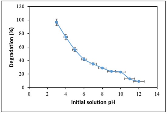 Solution pH is a vital agent for the photocatalytic degradation of pollutants in water, as industrial effluents have a complex nature. Hence, the impact of pH on the photocatalytic degradation of clothianidin by the NiO-GO composite was investigated by varying the pH in the range of 3–12 using a Britton–Robinson buffer. The concentration of clothianidin was maintained at 20 ppm, and the dose of NiO-GO composite was 0.05 g. The outcome is presented in Figure 8. The Figure exhibits that the degradation efficiency of NiO-GO decreases with an increase in pH of the solution, and maximum photocatalytic degradation (96%) was achieved at pH 3 within 60 min of reaction. The result implies that the acidic medium is more favorable for maximum degradation, which may be described by surface charges on the photocatalyst. The solution pH competes with the degradation of pesticides because it alters the surface charges on photocatalysts. Hence, charges on the surface are closely associated with the adsorption of pesticides before their photocatalytic oxidation. Based on the results obtained, it is suggested that the acidic medium favors higher degradation efficiency. Although zeta potential measurements were not performed in this study, it is hypothesized that at low pH, the surface of the NiO-GO composite may acquire a more positive charge, which could enhance the electrostatic interaction with the anionic clothianidin molecules (pKa = 11). This assumption aligns with previously reported studies on similar photocatalysts [70,71]. Hence, further photodegradation experiments of clothianidin were performed in an acidic medium (at pH 3).