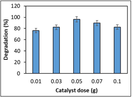 The catalyst dosage plays a critical role in evaluating the performance of photocatalytic degradation, as it directly affects the number of active sites available for the adsorption and subsequent degradation of pollutant molecules. In this study, the photocatalytic performance of the NiO-GO composite was examined using different catalyst doses from 0.1 to 1.0 g, while keeping the clothianidin concentration constant at 20 ppm and the reaction time at 60 min. The results obtained are given in Figure 9. The results confirm a distinct trend: the degradation performance increased with increasing catalyst dose up to 0.5 g, with a maximum of 96% degradation, beyond which a further increase in dosage resulted in a decrease in photocatalytic activity. The initial increase in degradation is due to the greater number of active sites and enhanced light absorption. Both of these factors facilitate the generation of electron–hole pairs and reactive oxygen species (ROS), which are essential for pollutant degradation. However, the observed decline in performance at higher doses may be due to several factors. First, excessive catalyst loading can cause scattering and shielding effects of light, which reduce the penetration of photons into the suspension and limit the activation of deeper catalyst layers. Second, agglomeration of catalyst particles may take place at higher doses and causes a decrease in available surface area, thereby lowering the number of accessible active sites. Third, the dense suspension is due to the high concentration of the catalyst, and the mass transfer of clothianidin molecules to the catalyst surface is hindered, further reducing degradation efficiency [72,73]. Similar trends have been reported in previous studies; therefore, it is of the utmost importance to optimize the catalyst dose to balance the trade-off between the availability of active sites and minimizing light attenuation effects. This finding highlights the importance of optimizing catalyst dosage for large-scale applications to ensure cost-effectiveness while maintaining high photocatalytic efficiency.