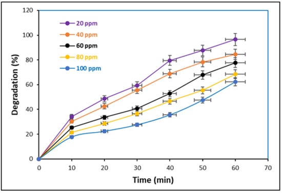 It is necessary to inspect the impact of the initial substrate concentration on photocatalytic degradation because the initial concentration of the substrate is an essential parameter and has a prominent effect on photocatalysis [74]. To find out the effect of initial clothianidin concentration on photodegradation, the initial concentration of clothianidin varied in the range of 20 to 100 ppm. The amount of NiO-GO composite (0.05 g) and pH (3) were kept constant. The results obtained are given in Figure 10. The data given in Figure 10 illustrates that there is an inverse relationship between the photodegradation efficiency of NiO-GO composite and the initial concentration of clothianidin. The degradation efficiency of the NiO-GO nanocomposite decreased from 96% to 62% with an increase in the initial concentration of clothianidin from 20 to 100 ppm. This outcome may be justified by using Beer–Lambert’s law, which states that as a concentration increases, the path length of incoming photons into the reaction mixture reduces, and a few photons might arrive at the surface of the photocatalyst. This implies that the efficiency of the NiO-GO composite declines by increasing the initial concentration of clothianidin [75,76,77].
