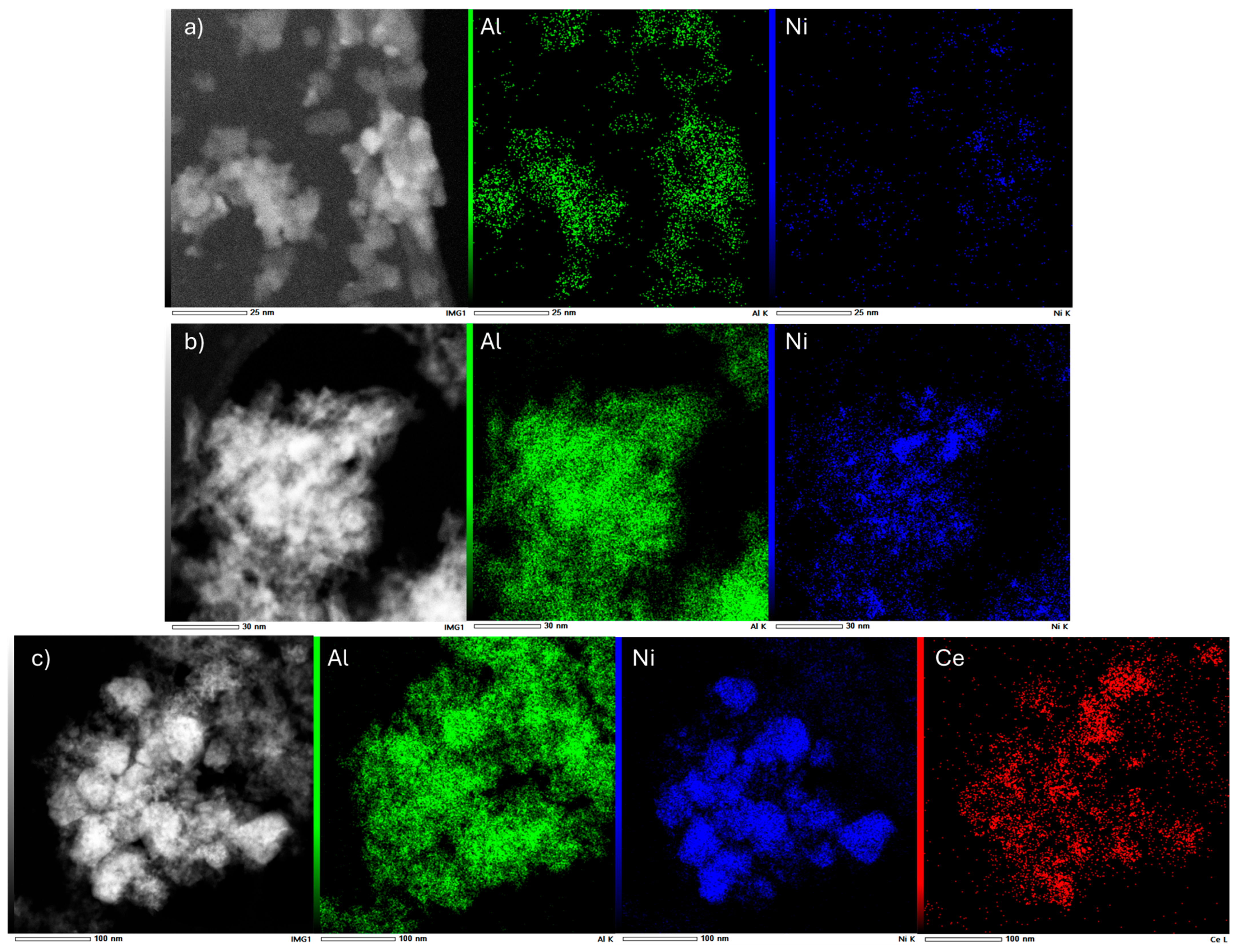 - Alkhoori, A.A.; Elmutasim, O.; Dabbawala, A.A.; Vasiliades, M.A.; Petallidou, K.C.; Emwas, A.H.; Anjum, D.H.; Singh, N.; Baker, M.A.; Charisiou, N.D.; et al. Mechanistic Features of the CeO2-Modified Ni/Al2O3 Catalysts for the CO2 Methanation Reaction: Experimental and Ab Initio Studies. ACS Appl Energy Mater 2023, 6, 8550–8571. [Google Scholar] [CrossRef]