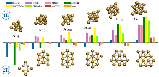 Histogram-like representation of the energy difference between the planar and three-dimensional forms of the cluster from Au8 to Au13, along with their geometry. The scheme allows us to appreciate at a glance the crossing point predicted by the different functionals considered in this work. For the exact energy values, please see Table 2.