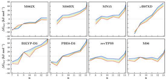 The thermal and entropic effects on the relative stability of the two- and three-dimensional gold clusters can be also evaluated by considering the difference between their Gibbs free energy values, . These are collected in Tables S1–S8 of the Supporting Information and shown in Figure 2 for the Au7–Au14 and for temperature values in the range 100–600 K. Excluding very specific cases (such as Au8 for M062X and B97XD), it can be noted that the becomes more negative as the temperature increases, indicating that at high temperatures the two-dimensional form should be increasingly favored. In the temperature range from 100 to 600 K, according to some functionals and with different magnitudes, a one-unit forward shift in the 2D-3D transition point is observed. It is also worth mentioning the case of Au9 which, in agreement with three out of eight functionals (B3LYP-D3, PBE0-D3 and M06), shows two irregularities: depends negligibly on the temperature and has a more positive, or less negative, value than those relating to the Au8 and Au10 clusters.