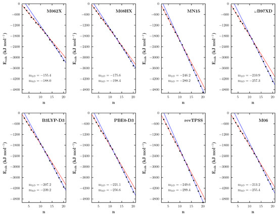 In the eight panels, the cohesion energy versus the number of atoms in the Au cluster is reported. Red lines (with angular coefficients labeled as ) represent the results of the linear fit of the data sets associated with planar structures, while blue lines (with as angular coefficients) result from the fit of the data sets regarding three-dimensional structures.