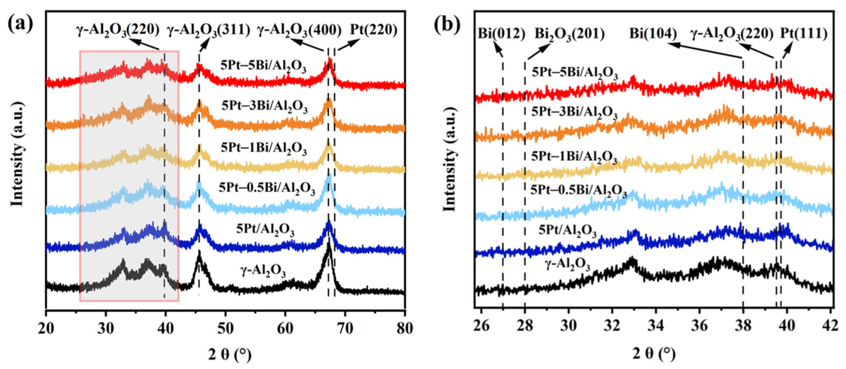 2.1. Physiochemical Properties of 5Pt/Al2O3 and 5Pt–nBi/Al2O3 Catalysts