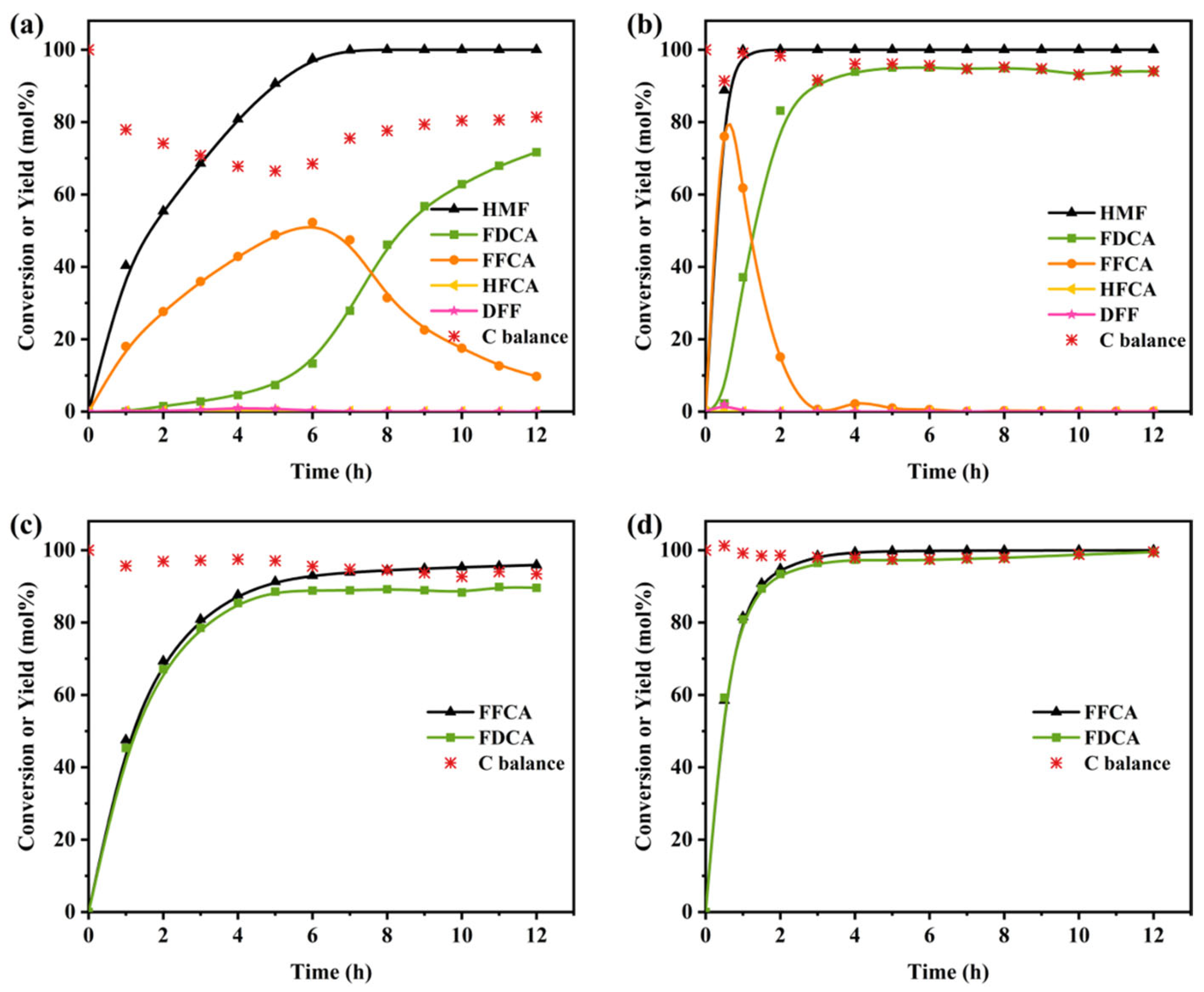 - Zhang, Y.; Liu, Y.; Xia, Q.; Chen, Y.; Kong, L.; Yan, X.; Guan, W.; Pan, J. Ambient Temperature Catalyzed Air-Oxidation of 5-Hydroxymethylfurfural via Ternary Metal and Oxygen Vacancies. Green Energy Environ. 2025, 10, 1568–1582. [Google Scholar] [CrossRef]