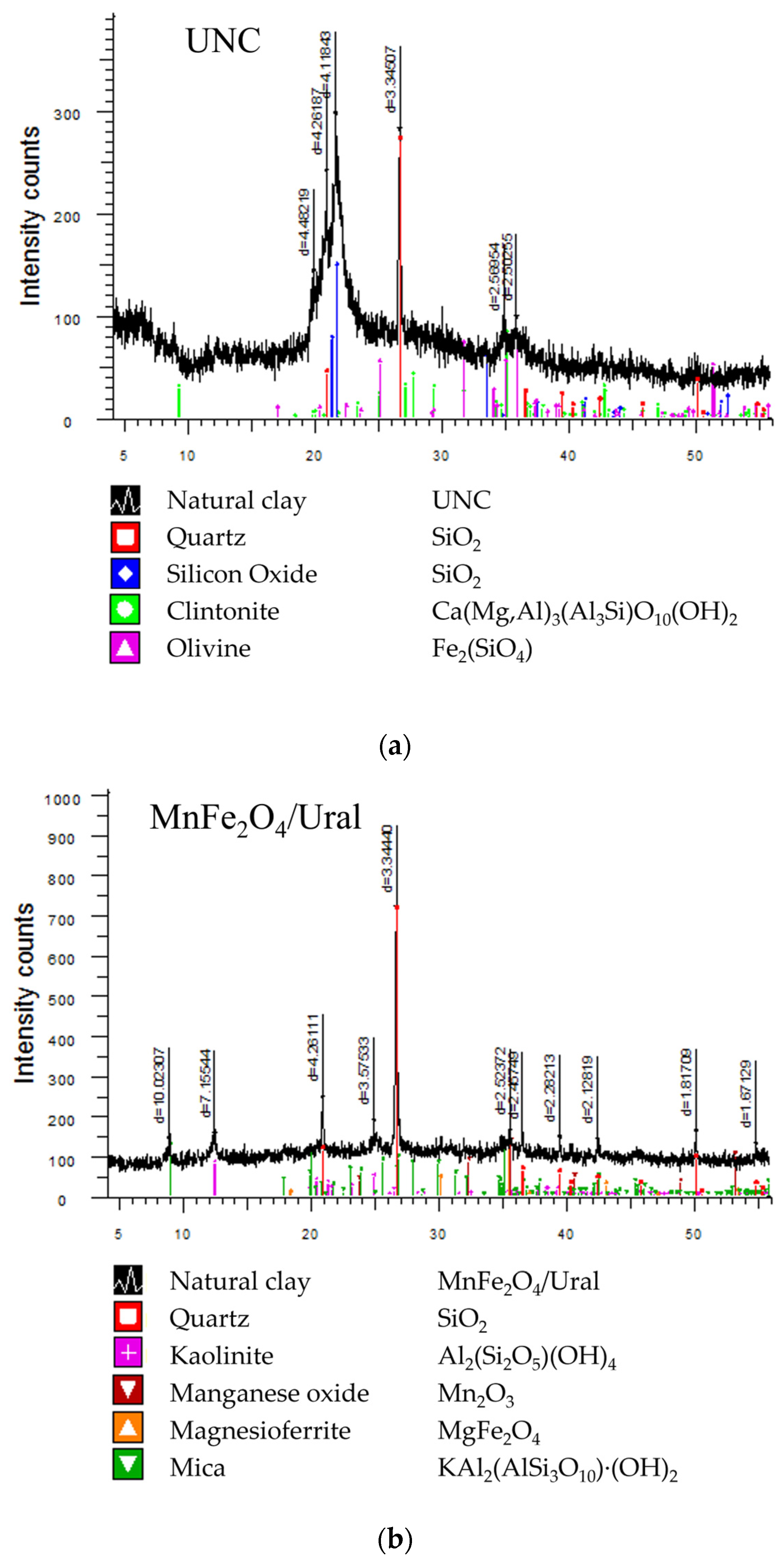To characterize the materials, various analyses were used. The elemental composition of the natural clays was obtained using Electron Microprobe (EMP) analysis. X-ray diffraction analysis of samples of natural (UNC) and modified clay (MnFe2O4/Ural and MnFe2O4/Shymkent) were performed using an automated DRON-3 diffractometer (Burevestnik, Russia) with CuKα radiation (λ = 1.5406 Å) and a nickel β filter to eliminate secondary radiation. Diffraction patterns were recorded in the θ–2θ geometry under the following operating conditions: tube voltage U = 35 kV, current I = 20 mA, scanning speed 2°/min, step size 0.02°, and angular range 2θ = 5–70°. To ensure accuracy and minimize statistical errors, each measurement was performed at least three times, and the averaged results were used for further analysis. Before the study, clay samples were dried at a temperature of 105 ± 5° C to obtain constant mass and crushed in an agate mortar to a powder with a particle size of less than 40 μm. The diffraction data were processed and analyzed using the ICDD PDF-2 database (powder diffraction file) and reference diffraction patterns of pure minerals. The phases were identified based on characteristic interplane distances (d-values) and relative reflection intensities. Special attention was paid to the MnFe2O4 spinel type phase, which exhibits the most intense reflections at 2θ ≈ 30.1°, 35.4°, 43.0°, 57.3°, and 62.9°. The quantitative determination of the MnFe2O4 content was carried out by a semi-quantitative method using the equal weight method and an artificial mixture. For artificial mixtures of standard materials containing known concentrations of MnFe2O4 (in the range from 0 to 50 wt.%) calibration curves were prepared and constructed based on the intensity dependence of the most characteristic MnFe2O4 (I = 35.4°). The peak depends on the concentration of ferrite. To normalize the diffraction intensity, the reflection of quartz (SiO2, 2θ ≈ 26.6°), which is present in all samples, was used as an internal standard. The relative quantitative ratios of the crystalline phases were calculated based on the average integral intensities of their respective peaks. Broad reflections of low intensity were observed in natural clays (UNC), indicating the presence of amorphous or weakly crystallized phases (for example, kaolinite and aluminum hydroxides). On the contrary, the modified samples showed distinct reflections corresponding to MnFe2O4, which confirms the formation of the crystal structure of spinel after modification. The total relative error in the quantitative determination of MnFe2O4 using the equilibrium and artificial mixture method was estimated at ±5–7%, which is typical for semi-quantitative X-ray phase analysis.