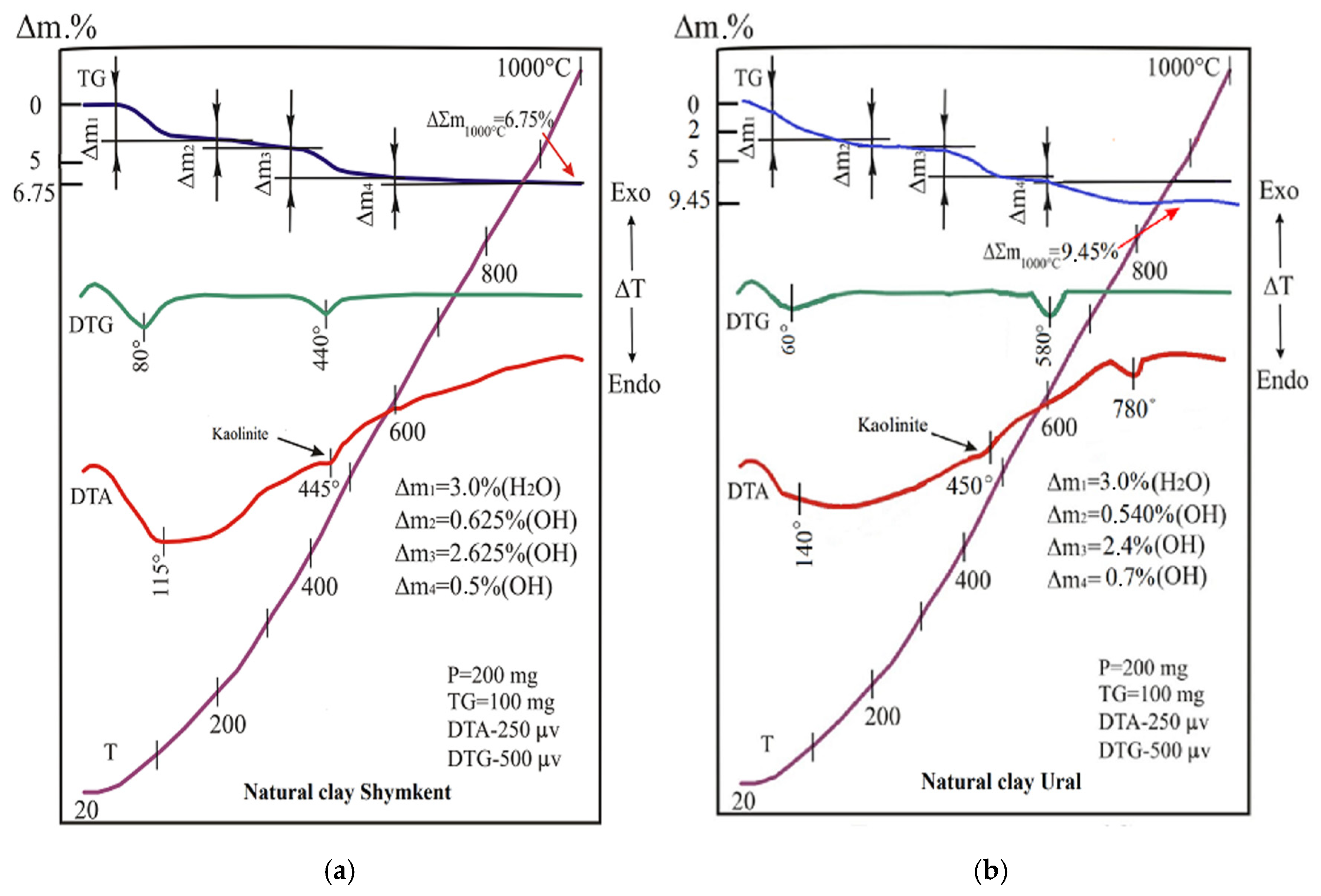 At 20–200 °C, a mass removal is observed, caused by the dehydration of montmorillonite and hydromica. In addition to layered silicate minerals, the samples also contained silica, represented by quartz—a thermally inert mineral. Quartz undergoes a reversible polymorphic transformation upon heating at approximately 500 °C. In this temperature range, the endothermic peak observed on the DTA curve, corresponding to the dehydroxylation and structural breakdown of kaolinite, completely overlaps with the thermal effect associated with the quartz phase transition.