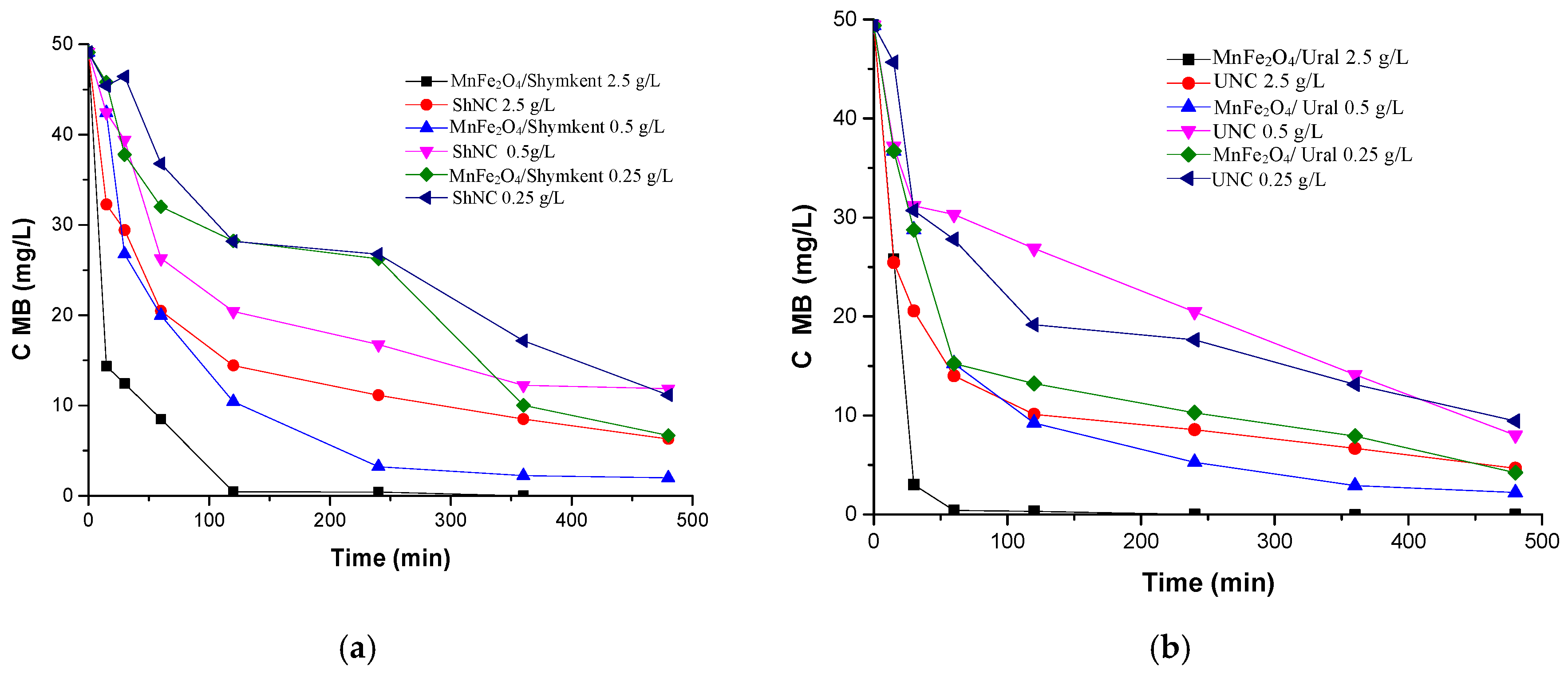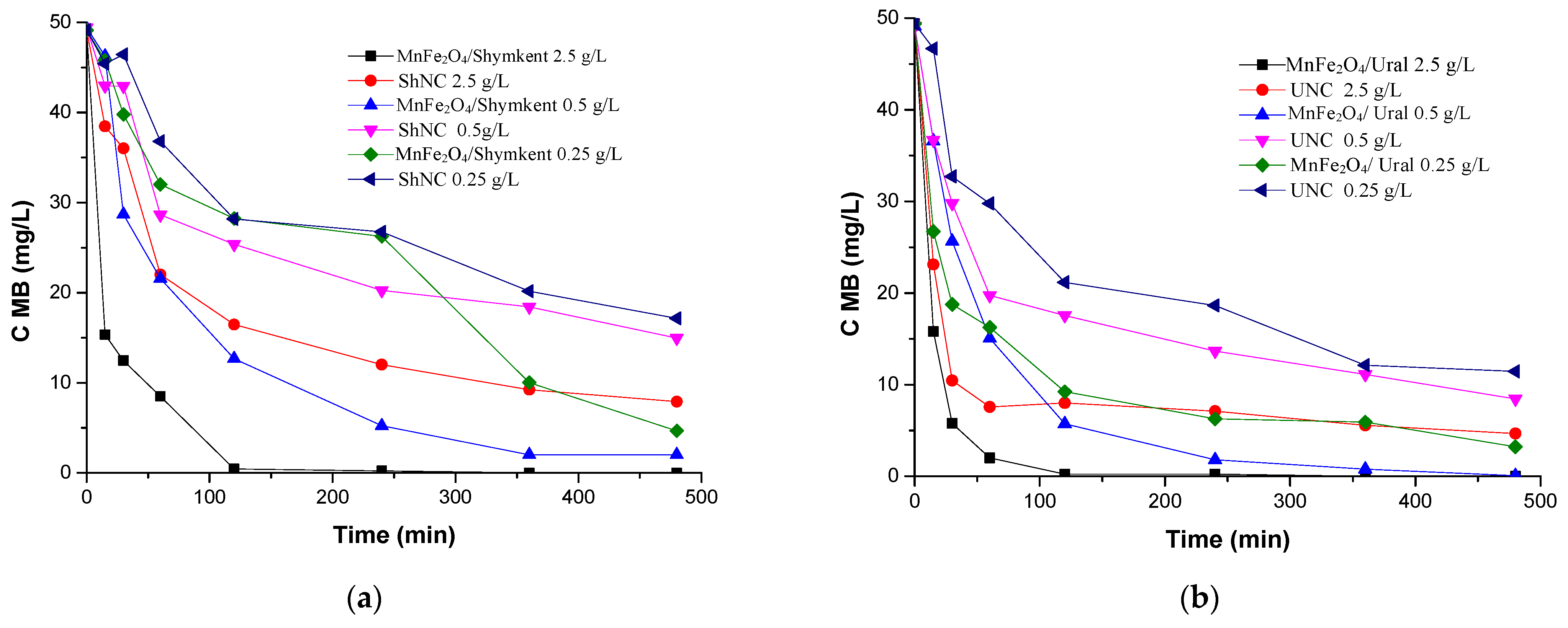 4/Ural completely decomposes MB within 60 min, whereas at 0.25 g/L the conversion remains partial, not exceeding 20–30% after 480 min. This difference can be explained by the larger surface area and the increased number of active sites available at a higher catalyst load.