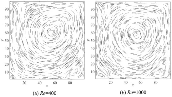 Firstly, to verify the accuracy of the LBM code in our work, the standard lid-driven cavity flow was adopted, which is a widely used benchmark for incompressible fluid dynamics. The simulation was performed in a square cavity with side length L = 100, which was filled with fluid. The top boundary moved horizontally to the right at a constant velocity, while the other three walls remained stationary. At steady state, a primary vortex formed in the center of the cavity, with secondary vortices emerging near the bottom left and right corners. Simulations were conducted at Reynolds numbers of 400 and 1000, with a grid resolution of 256 × 256, a lid velocity of 0.1, and relaxation times determined inversely from the Reynolds number. The resulting flow patterns are shown in Figure 1. Quantitative comparisons of the center positions of the primary and secondary vortices were made against results from References [31,32] under identical conditions, as summarized in Table 1. The labels (a)–(c) in the table denote results from Refs. [31,32] and this work, respectively. The close agreement among the three sets of results confirms the correctness of the present LBM code.