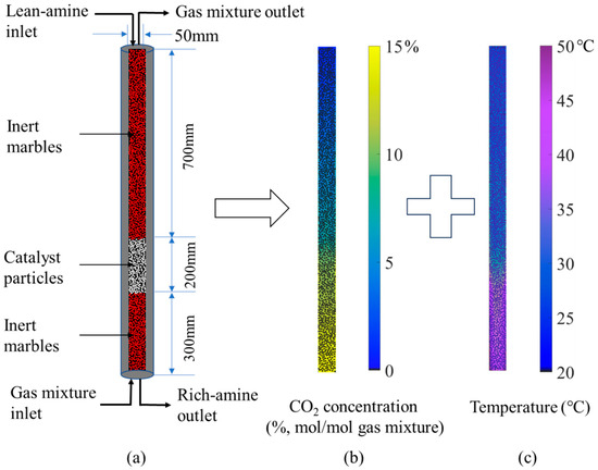 In order to validate the accuracy of the simulation results, LBM calculation was performed based on the full-length dimensions of the absorption column from the pilot-scale setup described in the literature [33]. The resulting CO2 concentration in the gas mixture and absorbent temperature distributions are shown in Figure 2. The computational domain covers the entire reactive region inside the absorption column, including both inert marbles and catalyst particles. The results in Figure 2b show that the CO2 concentration in the gas mixture decreases progressively along the flow direction starting from the gas mixture inlet at the bottom, eventually approaching complete absorption. Figure 2c indicates that the absorbent temperature increases gradually from the lean-amine solution inlet at the top, driven by the exothermic absorption reaction. Furthermore, the pronounced color gradient in the contour plots occurs precisely within the catalyst-packed section, revealing substantially different degrees of CO2 absorption and temperature variation in the catalytic zone compared to the non-catalytic sections.