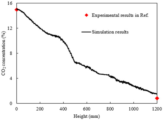 Figure 3 presents detailed simulation results of the average CO2 concentration in gas mixture along the column height, showing a trend consistent with the contour plot in Figure 2b. The profile exhibits a distinct three-stage variation, corresponding precisely to the three-section particle arrangement of marbles–catalyst–marbles along the full length. The magnitude of concentration change in the catalyst segment is significantly greater than that in the non-catalytic sections, indicating a notable enhancement of CO2 absorption due to the catalyst. Furthermore, experimental data from Reference [33] were added for comparison. However, the experimental measurements in the literature could only determine the CO2 concentrations of gas mixture at the inlet and outlet of the column, without resolving the internal concentration distribution. The CO2 concentration at the gas mixture inlet in the present simulation was set to be consistent with the experimental conditions. The simulated average concentration at the outlet is approximately 1.4%, which matches reasonably well with the experimentally measured value of 0.5% reported in Reference [33]. More precise quantitative analysis reveals that the experimental concentration difference between the inlet and outlet was about 14.2%, while the simulated value was 13.4%, yielding a relative error of only 5.6%.
