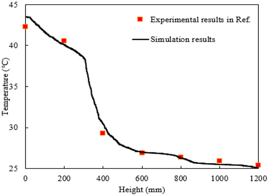 Figure 4 presents detailed simulation results of the average absorbent temperature along the column height, showing a trend consistent with the contour plot in Figure 2c. The temperature profile also exhibits a clear three-stage variation. These simulation results also confirm that the catalyst significantly accelerates the CO2 absorption reaction, thereby releasing more heat and causing a more pronounced temperature change in the catalytic segment compared to the non-catalytic sections. Experimental data from Reference [33] are added for comparison, which were obtained from six thermocouples by evenly distributed along a 1.2 m absorption column. The simulated temperature distribution closely matches the measured experimental values. More precise quantitative analysis reveals that the average temperature deviation across the monitoring points was approximately 0.55 °C, corresponding to a relative error of only 1.8% with respect to the average temperature along the entire length. In summary, the simulated average CO2 concentration of the gas mixture at the outlet and the internal solution temperature distribution match Reference [33]’s data well, thereby validating the reliability of the present simulation.