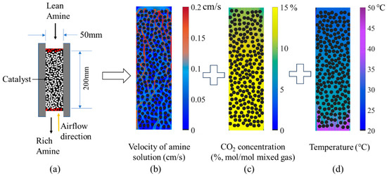 Schematic diagram of the catalyst section (a); velocity distribution of amine solution (b); distribution of CO2 concentration in the gas mixture (c) and absorbent temperature (d) after convergence (baseline operation conditions at 600 iterative steps).