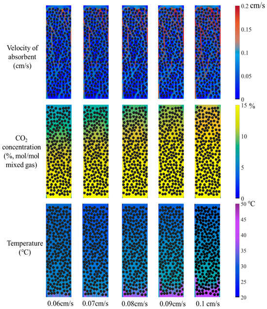 The absorbent solution flow rate range of 70–90 mL/min in Reference [33] corresponds to a velocity of approximately 0.06–0.08 cm/s based on the inner diameter of the absorption column. In this study, while keeping other operating conditions constant, a velocity gradient ranging from 0.06 to 0.1 cm/s was investigated. The corresponding contour plots are shown in Figure 7. A clear increase in red areas within the microchannels is observed as the solution velocity rises, indicating a notable expansion of high-velocity regions. With the CO2 concentration of gas mixture fixed at 15% at the inlet, the concentration at the outlet can be compared with different cases. As the solution velocity increases, the blue-green area gradually diminishes while the yellow zone expands, reflecting a progressive increase in CO2 concentration at the outlet. Under a constant lean-amine inlet temperature of 27 °C, the temperature at the rich-amine outlet can be compared. It was found that the purple area expands with increasing solution velocity, indicating a clear temperature rise at the outlet.