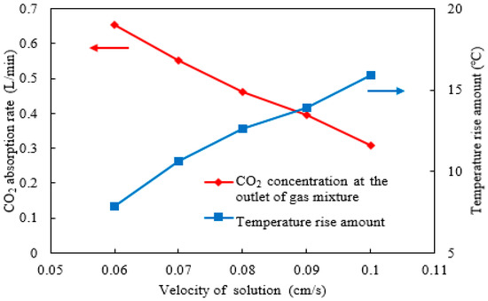 The CO2 absorption rate and rise in absorbent temperature under different solution velocities.