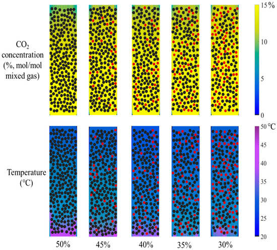 The catalyst concentration is a critical parameter in catalytic reaction processes. Determining the optimal catalyst loading within a confined space requires urgent investigation. To ensure the absorbent fluid flows smoothly through the particle-packed absorption column without clogging, adequate channel space must be maintained. Thus, the volume fraction of catalysts relative to the total space should not be excessively high. In this study, while keeping other operating conditions constant, the catalyst volume fraction was varied between 30% and 50%. The corresponding contour plots are shown in Figure 9. To ensure uniform dispersion of catalyst particles within the column, a reduced volume of catalyst was filled with inert marbles. In all the figures of the present work, black particles represent the catalyst, and red particles denote inert marbles. The total volume fraction of both particle types remained constant at 50%, resulting in negligible variation in absorbent velocity, which was therefore omitted from the analysis. The results indicate that as the catalyst volume fraction decreased, the blue-green area gradually shrank while the yellow zone expanded, reflecting an increase in CO2 concentration at the gas mixture outlet. Simultaneously, the reduction in catalyst volume fraction led to a contraction of the purple area, indicating a noticeable decrease in absorbent temperature at the rich-amine outlet.