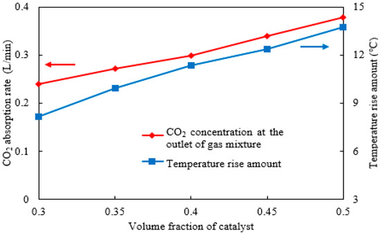 The CO2 absorption rate and absorbent rise in temperature under different volume fractions of the catalyst.