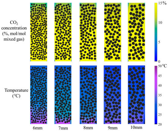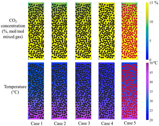 The distribution of CO2 concentration in the gas mixture and absorbent temperature under different absorbent–catalyst combinations. (The black circle represents the catalyst, and the red circle represents the inert small steel ball).