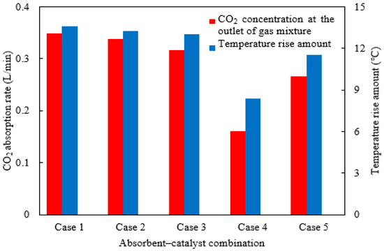 The CO2 concentration absorption rate and absorbent rise in temperature under different absorbent–catalyst combinations.