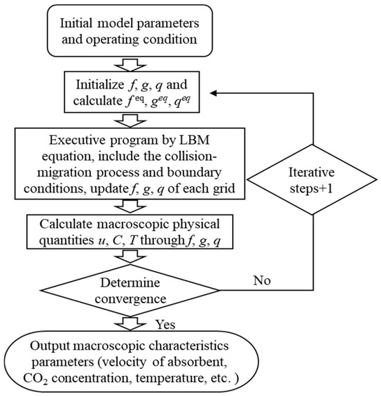 The numerical simulation of the CO2 absorption process in this study was established within the LBM framework. The flow of the absorbent solution, the CO2 absorption reaction, and the coupled heat transfer were simulated within the complex narrow channels of an absorption column packed with fine particles. The computational procedure is illustrated in Figure 16. Following the configuration of model parameters and initial operating conditions, the computational domain was discretized into a mesh, and the probability distribution functions (f, g, h) were initialized along with the calculation of their equilibrium distribution functions (feq, geq, qeq). The LBM equations were then solved by executing the collision-migration steps, updating the values of f, g, and h for each grid. Subsequently, we handled the boundary conditions equations, including those for walls, inlets/outlets, and obstacle particles, followed by another update of the f, g, and h values. The updated values of f, g, and h were used to calculate macroscopic physical quantities such as absorbent velocity, CO2 concentration, and temperature. The error between two consecutive computational results was checked against the convergence criterion. If the error exceeded the specified tolerance, the process returned to the second step for further iteration; if the error fell below the threshold, the solution was considered converged, and final characteristic parameters were output, which included absorbent velocity distribution, CO2 concentration distribution, and temperature distribution. The calculation program based on the LBM was implemented using Matlab R2024a software.