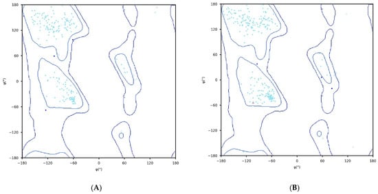 The predicted three-dimensional structures were validated to ensure their structural accuracy and reliability. Stereochemical quality was evaluated using Ramachandran plot analysis via the Ramplot server (https://www.ramplot.in) (accessed on 6 May 2025), which assesses the distribution of backbone dihedral angles phi (ϕ) and psi (ψ) to identify residues in favored, allowed, and disallowed regions. This analysis provides a crucial check for structural plausibility, as a high proportion of residues in favored regions indicates a well-modeled protein structure [].