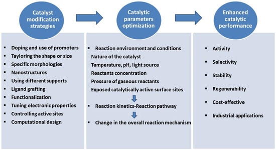 A thorough understanding of the composition, structure, and nature of active sites offers the opportunity to tailor catalytic properties to enhance catalytic performance, which encompasses both activity and selectivity. The properties that can be targeted through synthesis include controlled morphology [], sintering resistance [], a large specific surface area, optimal acid-base properties [], lattice vacancies, interactions between metal and support [], catalyst design, and conductivity, among others [,,]. Consequently, alterations in catalyst characteristics result in adjusted kinetic parameters (such as reaction rate and activation energy) [,] and influence the reaction mechanism, as schematically represented below (Scheme 1).