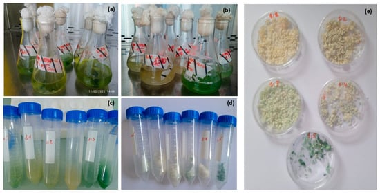 Immobilization of Cyanobacteria S1 strain by T. versicolor (BS7) grown in co-cultures with varying ratios (BS7:S1): (a) time 0, (b) for 24 h, (c) fresh harvested co-pellets, and (d,e) lyophilized co-pellets.