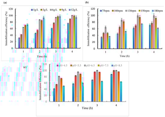 Effects of glucose concentration (a), shaking speed (b), and pH (c) on the immobilization efficiency of algal biomass attached to mycelial pellets. All values are means ± SD (n = 3).