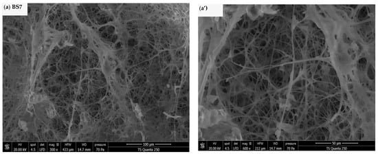 Scanning electron microscopy (SEM) was used for highlighting microstructural information and surface topography of lyophilized fungal, algal, and fungal–algal pellets photographed at various magnifications (Figure 3). As seen in Figure 4, the SEM micrographs provide valuable information regarding the morphological arrangement of the different pellets. The micrograph of the lyophilized fungal pellets (Figure 3a,a’) showed a closely aggregated, fibrous, and highly inter-entangled network. The general pellet structure overall appears to be dense under 300× magnification, while the 600× magnification renders the individual hyphae evident, which are filamentous in natural structures that make up the fungal mycelium. This three-dimensional, complex matrix provides the mechanical integrity and large surface area of the fungal pellets.