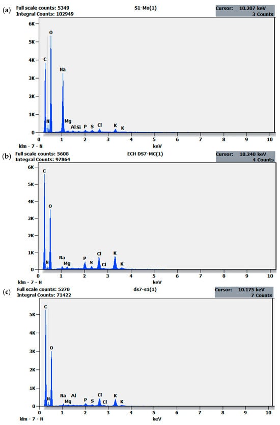 The results in Table 2 and the corresponding EDS spectra (Figure 4) confirm significant differences in elemental profiles, reflecting the distinct biological compositions of each biomass type. Carbon (C), nitrogen (N), and oxygen (O) are the dominant elements across all samples, as expected for biological materials.
