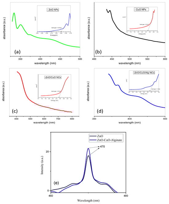 UV–vis spectra and band gap absorption spectra of (a) ZnO and (b) CuO NPs, and (c) ZnO/CuO and (d) ZnO/CuO/Alg NCs; (e) photoluminescence spectra of ZnO and ZnO/CuO/Alg NCs.