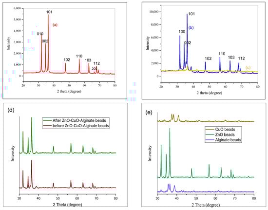 XRD analysis of (a) ZnO, (b) ZnO/CuO, (c) ZnO/CuO/Alg NCs. (d) XRD comparison of ZnO/CuO/Alg beads before and after use, and (e) comparison of the stability of used alginate-only hydrogel beads, ZnO hydrogel beads, and CuO hydrogel beads.