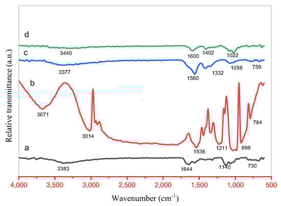 FTIR results of (a) ZnO, (b) CuO, (c) ZnO/CuO and (d) ZnO/CuO/Alg NC.
