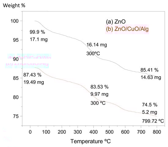 The initial mass of ZnO was 17.13 mg, which decreased to 14.6 mg after heating to 800 °C, indicating a total weight loss of about 14.49%. In contrast, the ZnO/CuO/Alg exhibited a more pronounced weight loss: starting at 19.49 mg and reducing to 5.28 mg at 796 °C, resulting in a total loss of approximately 72.91%. This greater reduction is attributable to the higher organic content, especially from the alginate biopolymer and phytochemicals incorporated during synthesis [7,47].